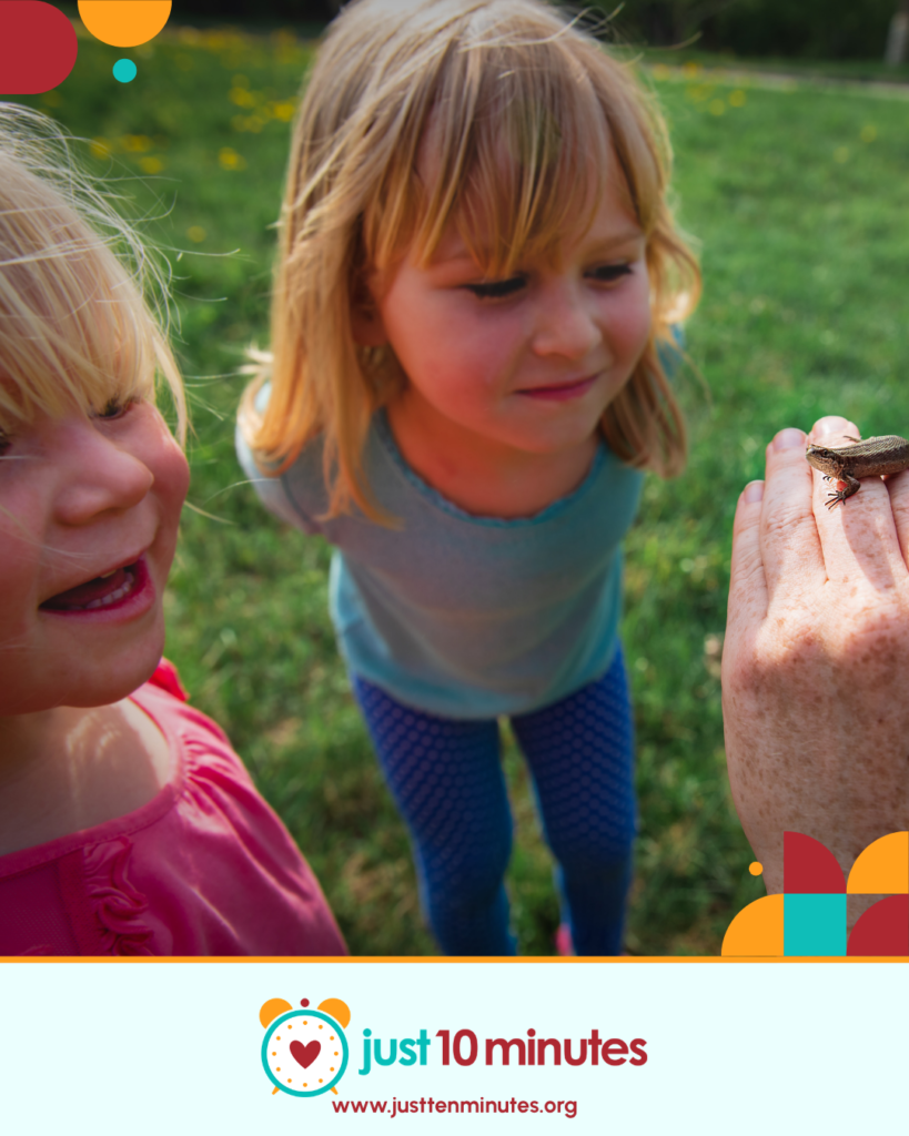 Smell the flowers, listen to the sounds around you, touch the grass and tree bark, and describe what the clouds look like. What else can you see and experience in nature together?