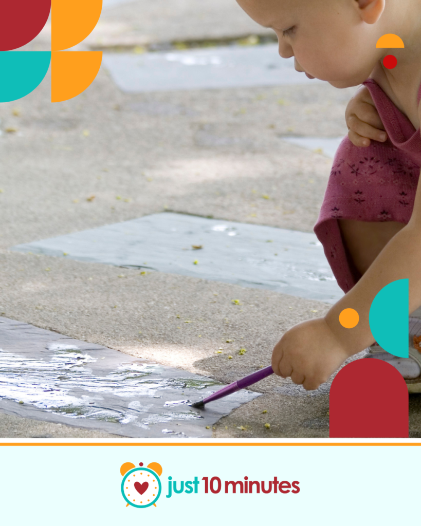 at outdoors. You will need a bucket or container of water, paintbrushes of various sizes, and a sunny for you and your child to dry quickly. You can also add sponges, spray bottles, and sidewalk chalk to add inspiration and sensory experience for your little artist.