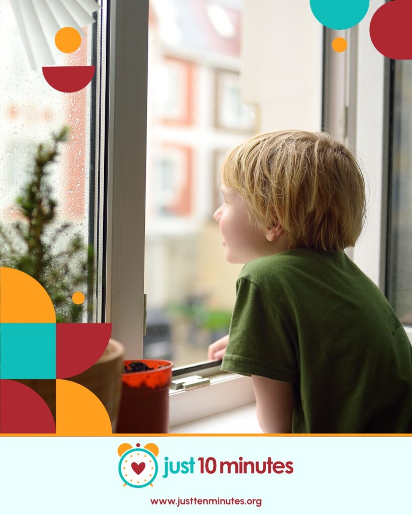 Look outside together and ask your child: “What’s the weather like today?” Is it sunny, snowy, rainy, cloudy, or windy? Act or sing it out; wiggle like raindrops, blow like the wind, or shine like the sun! It’s your loving and complete attention that counts.